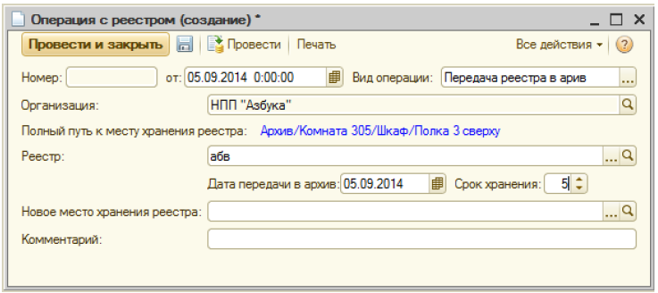 - Передача реестра в архив – в этой операции устанавливаются «Дата передачи в архив», «Срок хранения» и новое (постоянное) «Место хранения реестра».